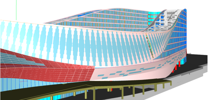 建筑設計為異形絲綢流線造型,結構輔以大跨度鋼構。因流線型造型給主體輪廓提出了更精準的要求,利用BIM技術根據幕墻模型確定各功能分區各層樓板邊界輪廓、及相關交界面,確保項目的美觀。