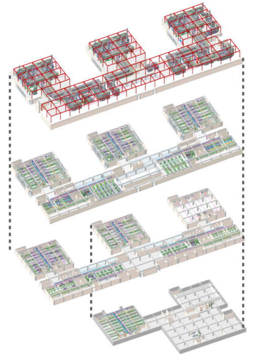 本項目實驗室設計采用模塊化設計,從單一標準實驗室出發,進行功能組合排布,得到高效的、整齊的的實驗室組合,通過BIM平臺的手段,擴大此設計手法的優點,所見即所得,為業主提供了更高效的、費用更低的、可視化的實驗室方案。