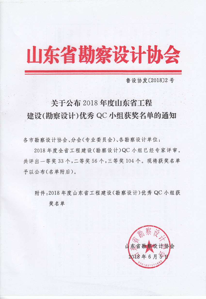 關于公布2018年度山東省工程建設(勘察設計)優秀QC小組獲獎名單的通知