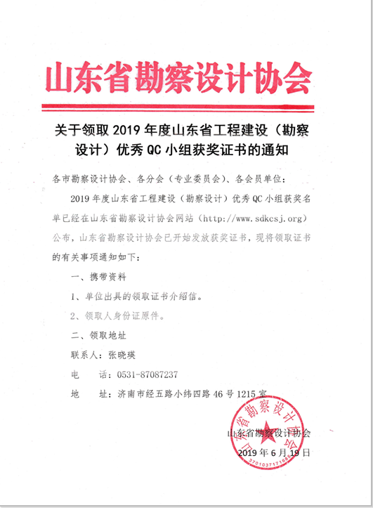 關于領取2019年度山東省工程建設(勘察設計)優秀QC小組獲獎證書的通知
