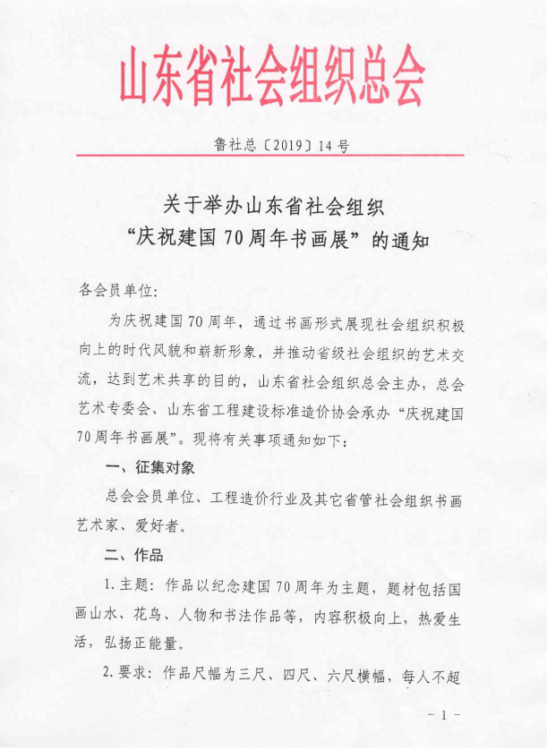 關于舉辦山東省社會組織“慶祝建國70周年書畫展”的通知