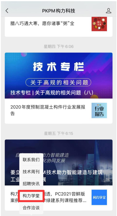 關注“PKPM構力科技”微信訂閱號,點擊主頁面“產品服務”的“PKPM構力學堂”即可進入免費課程界面。