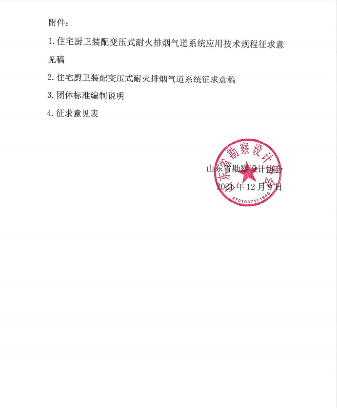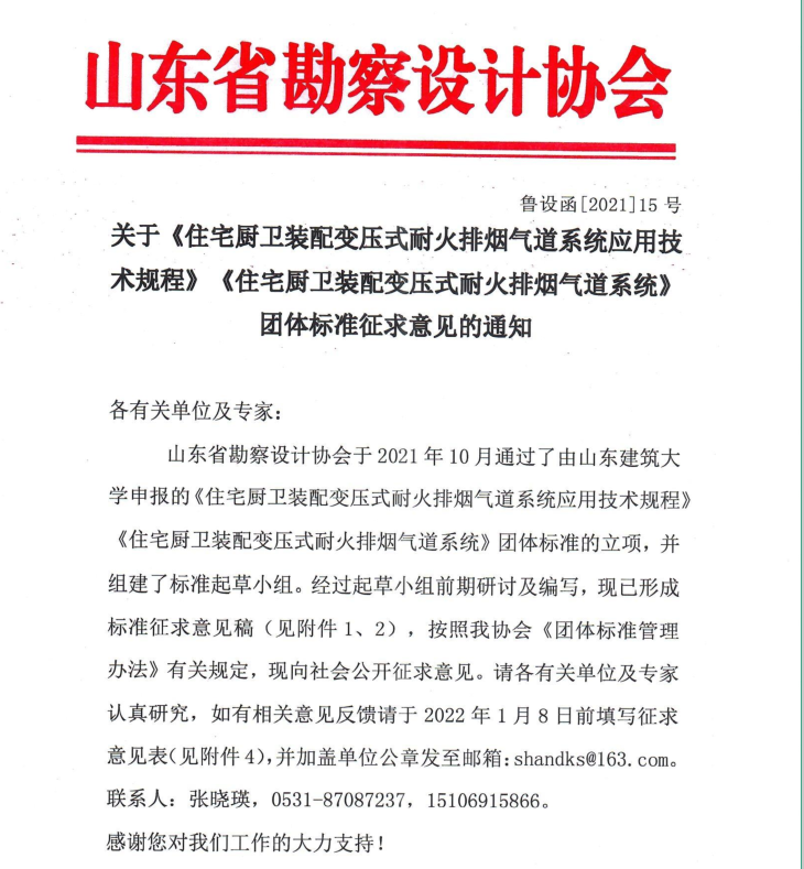 關于《住房廚衛裝配變壓式耐火排煙氣道系統應用技術規程》《住房廚衛裝配變壓式耐火排煙氣道系統》團體標準征求意見的通知