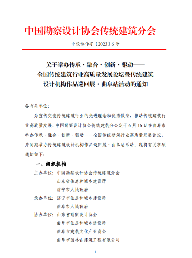 附件:轉發中國勘察設計協會傳統建筑分會《關于舉辦傳承?融合?創新驅動——全國傳統建筑行業高質量發展論壇暨傳統建筑設計機構作品巡回展?曲阜站活動的通知》
