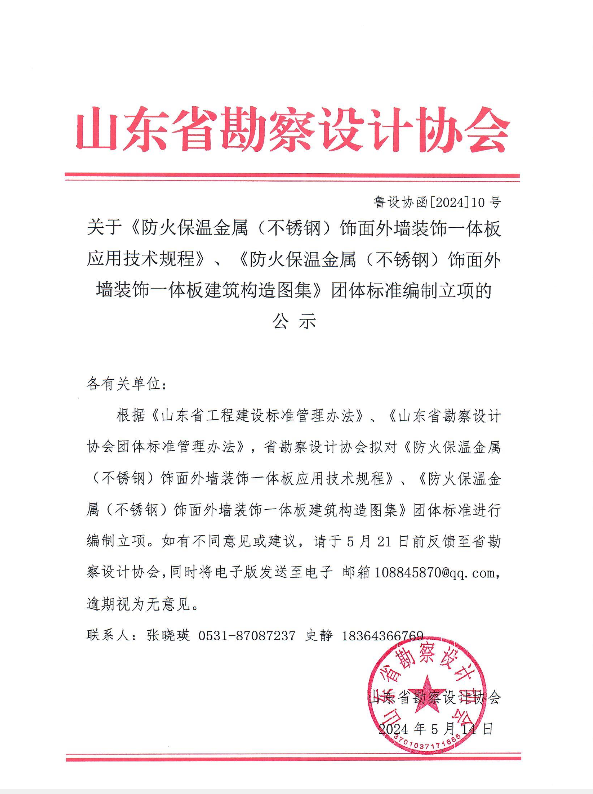 附件:關于《防火保溫金屬(不銹鋼)飾面外墻裝飾一體板應用技術規程》、《防火保溫金屬(不銹鋼)飾面外墻裝飾一體板建筑構造圖集》團體標準編制立項的 公 示