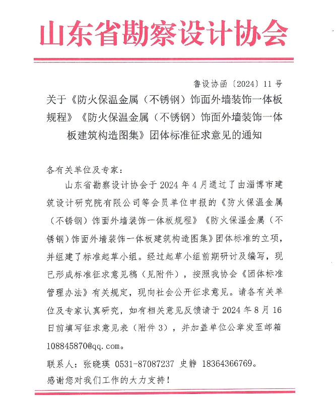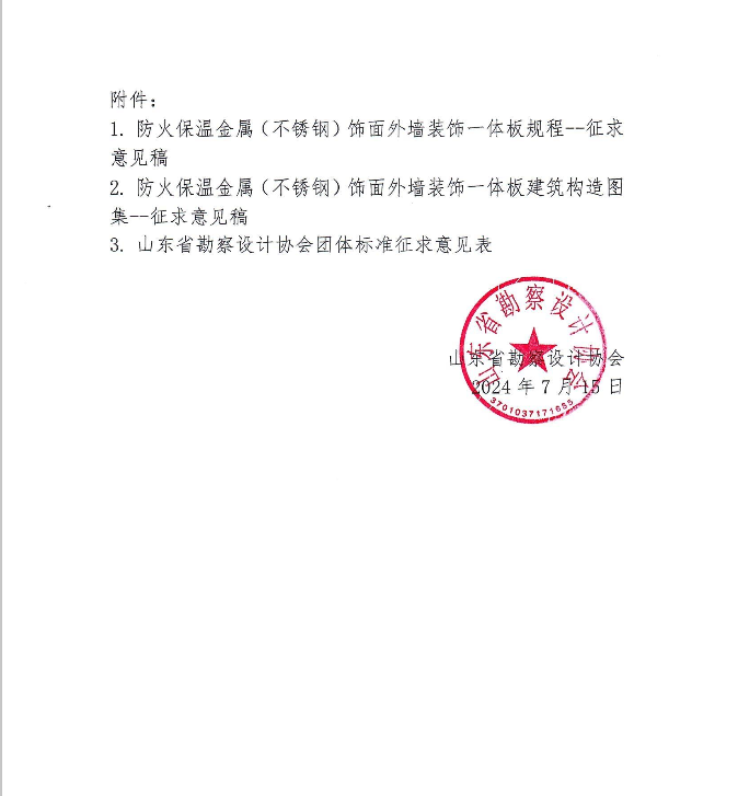 關于《防火保溫金屬(不銹鋼)飾面外墻裝飾一體板規程》《防火保溫金屬(不銹鋼)飾面外墻裝飾一體板建筑構造圖集》團體標準征求意見的通知