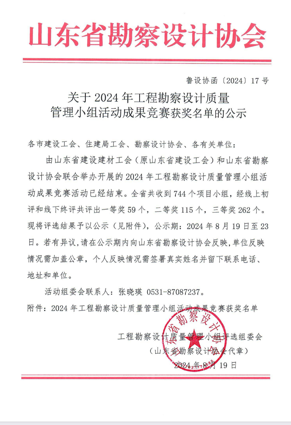 附件:關于2024年工程勘察設計質量 管理小組活動成果競賽獲獎名單的公示