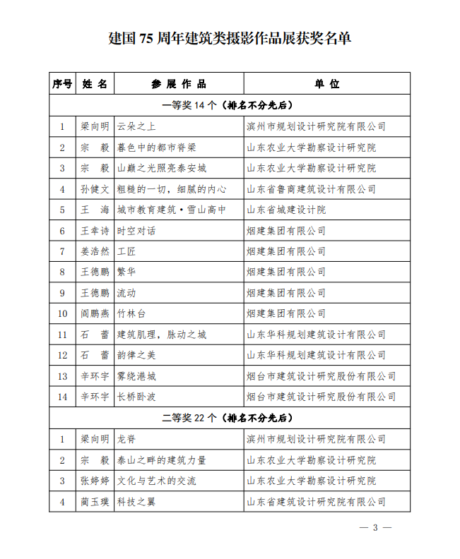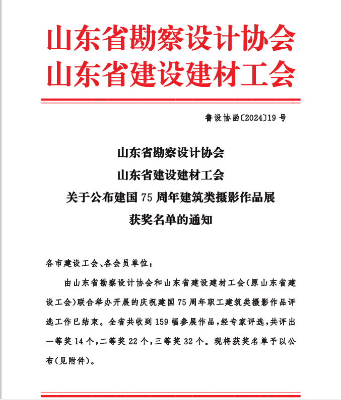 附件:山東省勘察設計協會 山東省建設建材工會 關于公布建國75周年建筑類攝影作品展 獲獎名單的通知