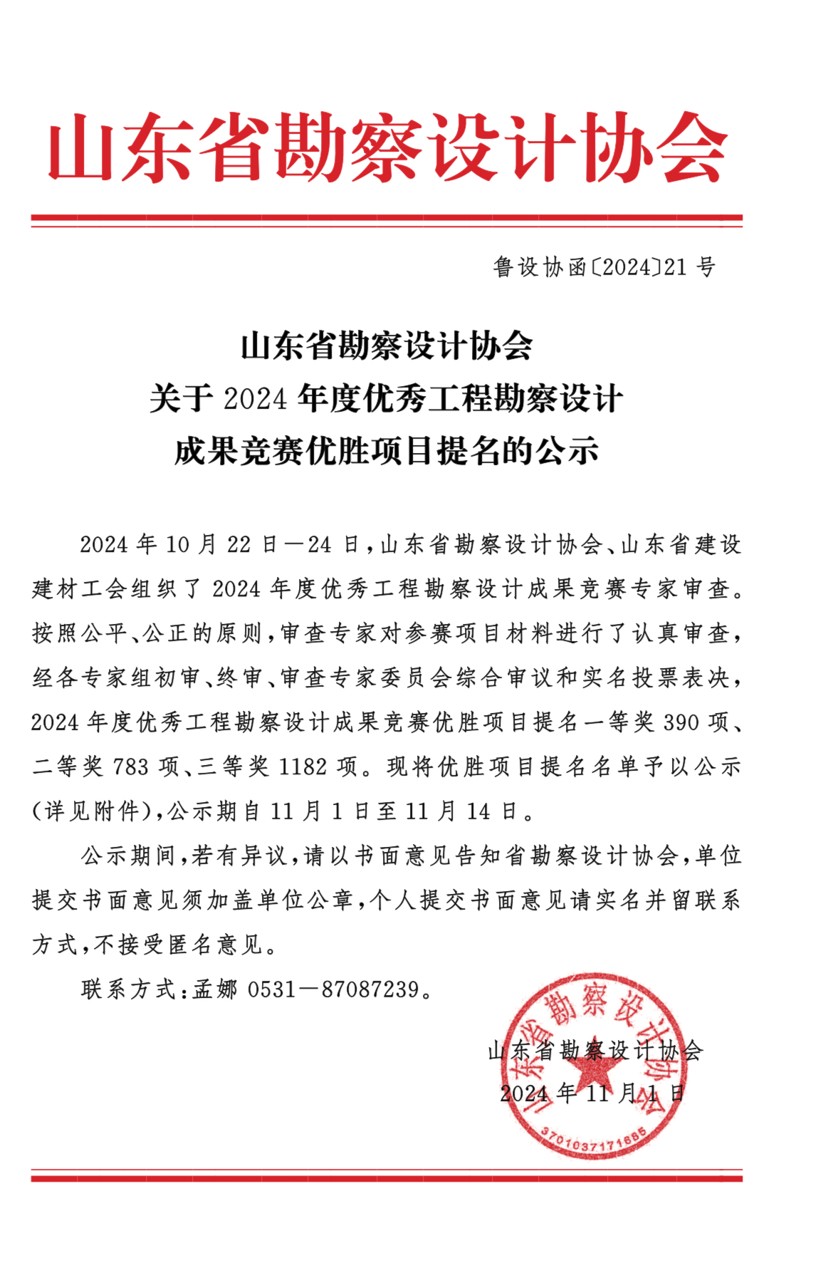 附件:《山東省勘察設計協會 關于2024年度優秀工程勘察 設計成果競賽優勝項目提名的公示》