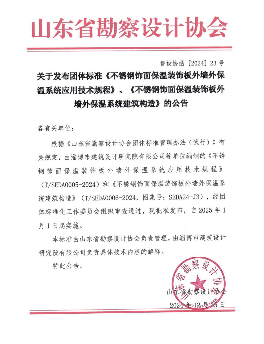 附件:關于發布團體標準《不銹鋼飾面保溫裝飾板外墻外保溫系統應用技術規程》、《不銹鋼飾面保溫裝飾板外墻外保溫系統建筑構造》的公告