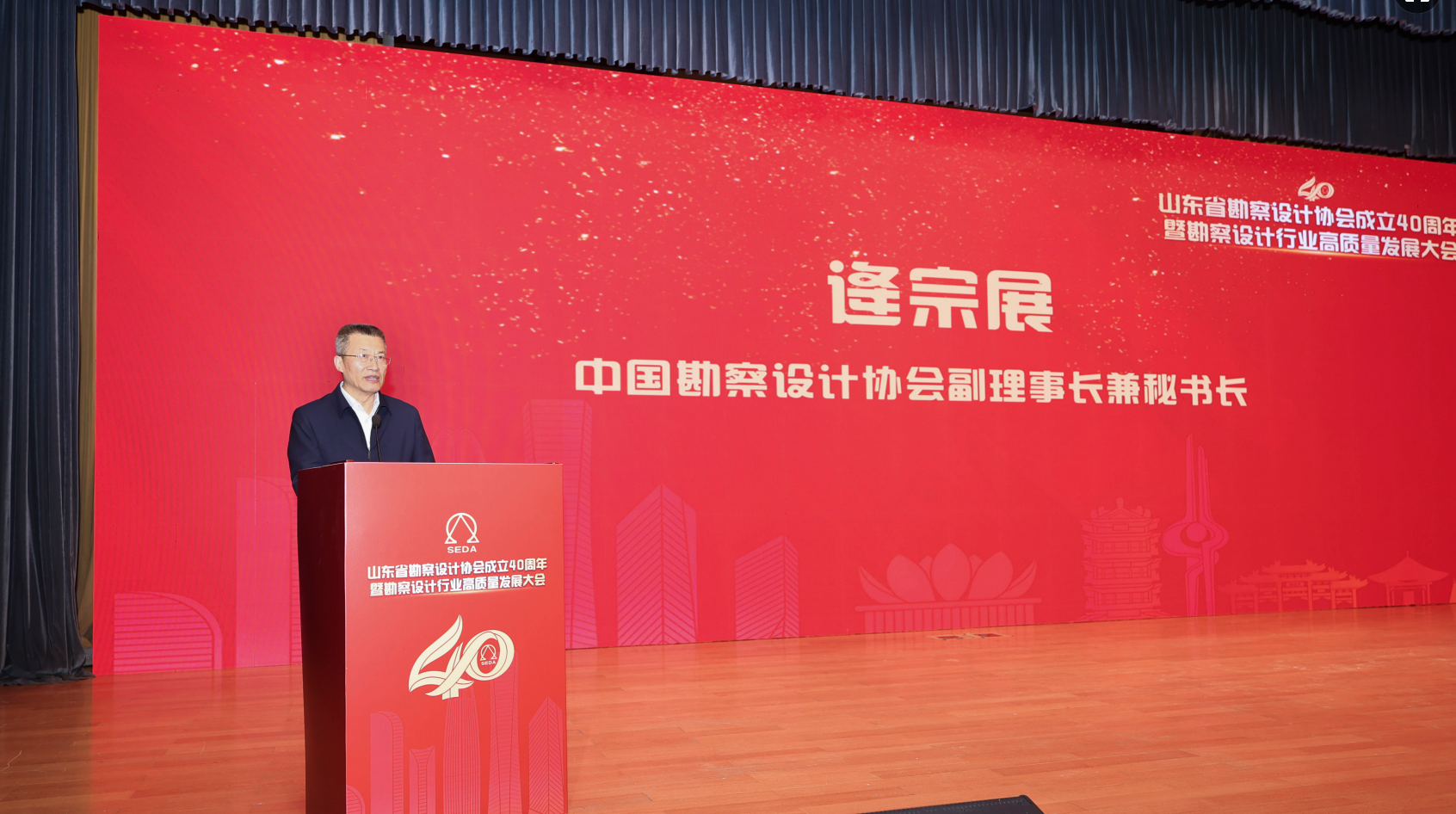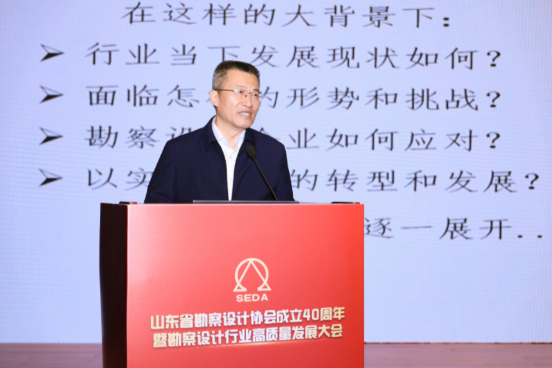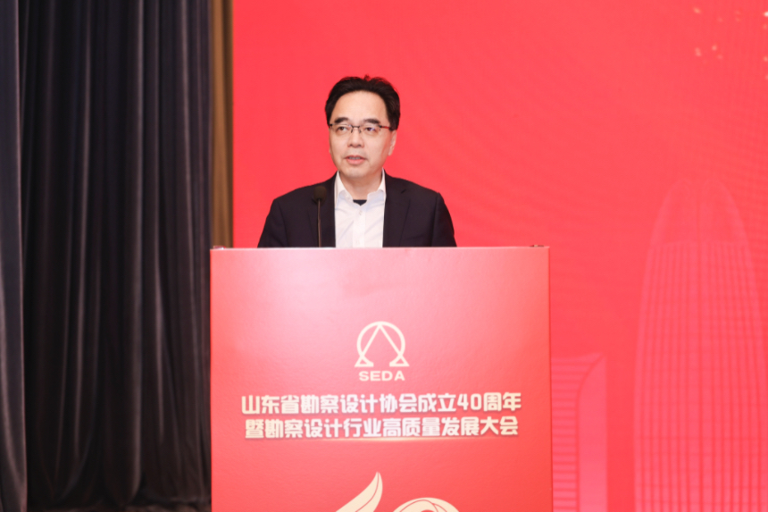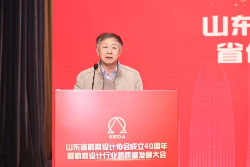 中國勘察設計協會副理事長兼秘書長逄宗展同志出席會議并致辭,他代表中國勘察設計協會向山東省勘察設計協會成立40周年表示熱烈祝賀,高度肯定了山東省勘察設計協會成立40年來在服務行業發展、推動技術創新進步、促進專業人才培養等領域方面的豐碩成果,以及為“中國建造”“中國設計”貢獻的山東經驗與力量。同時,逄宗展同志對勘察設計行業未來發展提出殷切希望:一是強化行業引領,在服務發展大局上展現新作為;二是聚力科技創新,在推動行業轉型升級上實現新突破;三是提升服務效能,在營造優良發展環境上體現新擔當。